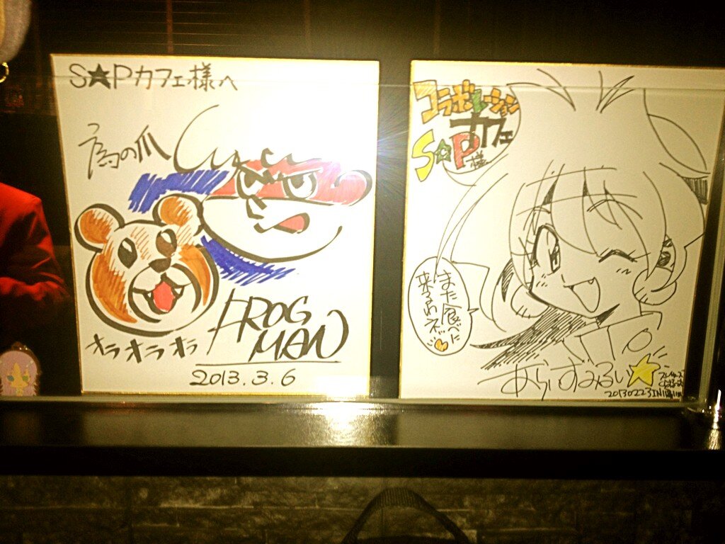 右の色紙と画力の差が半端ねぇ RT @manaby76: @yoshida_justice 吉田くん、今日秋葉原のすたちゃカフェ @starchild_cafe 行って来たんだけど、吉田くんとレオナルド博士の色紙あったw #鷹の爪 pic.twitter.com/Q0uftrRJeq