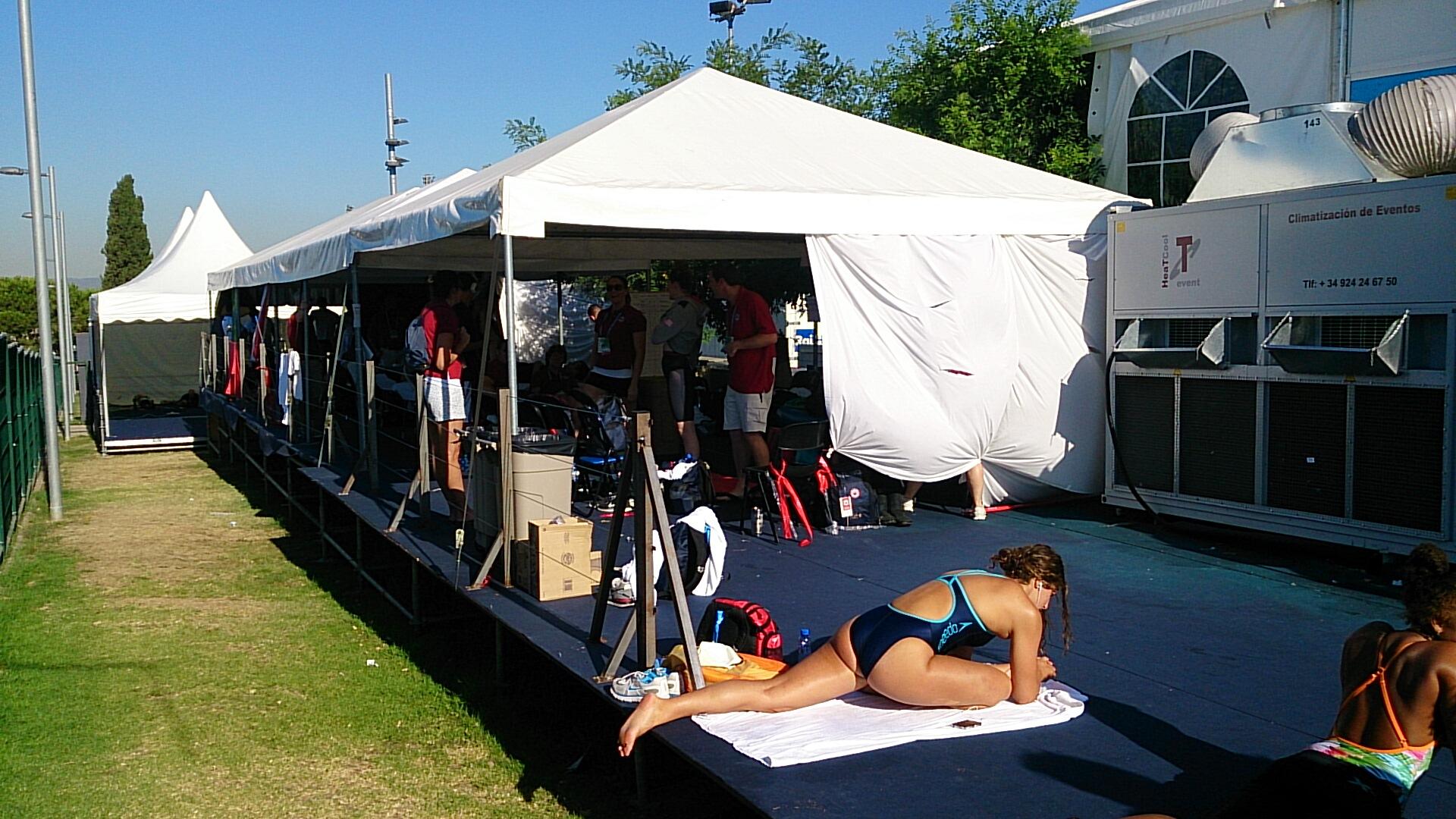 サブプールに選手が入りきらず、脇に屋外テントが増築されています。この白いテントの下がアメリカチームのベースになってます。気候も爽やかで、みな気持ち良さそうです! #sesui #世界水泳 pic.twitter.com/rVqSSiERIo