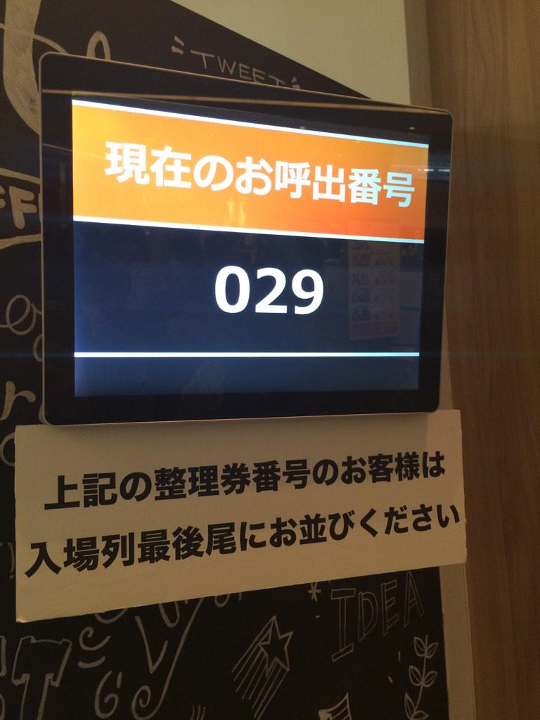ただいま整理券配布させていただいております。現在29番までのお客様まで列にお並びいただけます。列にお並び後も入店までお時間を頂きます。ただいま70組様待ちです。約4時間後の列へのご案内となります。