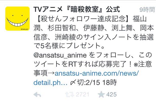 56000(殺せん)フォロワー達成御礼!メインキャストサイン入りノート抽選プレゼント受付中!応募RT&詳細は昨日の該当ツイート(この画像)にて‼︎応援感謝です‼︎ #暗殺教室 pic.twitter.com/N0AfnNt3cV2015年2月8日 15:17