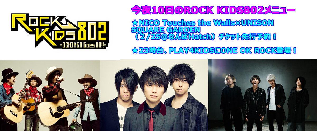 2月10日のROCK KIDS802では、NICO Touches the Walls×UNISON SQUARE GARDENチケット先行予約を受付ます! #fm802 #rk802 pic.twitter.com/DkTKd09e71
