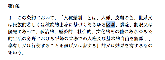 曽野綾子氏は「差別と区別は違う」「居住区を分けるのは良いことだ」と発言した。だが、人種や民族に基づいて人を区分することを「差別」という。人種差別撤廃条約の第1条を示しておく。 #ss954