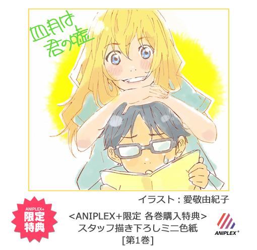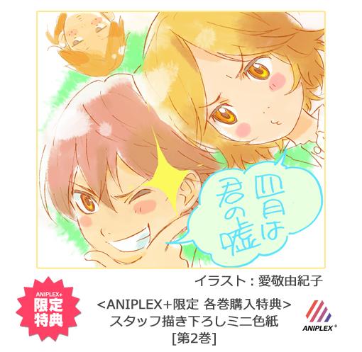 #アニプラ [特典情報]「四月は君の嘘」BD/DVD各巻購入特典の「スタッフ描き下ろしミニ色紙」第2巻のデザイン公開♪第1巻と並べるとさらに可愛い~! goo.gl/oGzifT #君嘘 pic.twitter.com/CbcgbQnFel