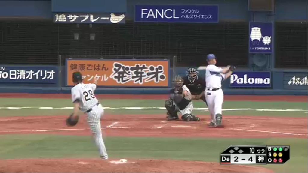10回表、福留!安部からセンターへ2点タイムリヒット!!やっぱここで仕事するドメさんはさすがやね!!ベイスターズは5番手小杉がマウンドへ。阪神4-2DeNA。 hanshintigers.jp/tw/100/ #hanshin #tigers #阪神 #タイガース