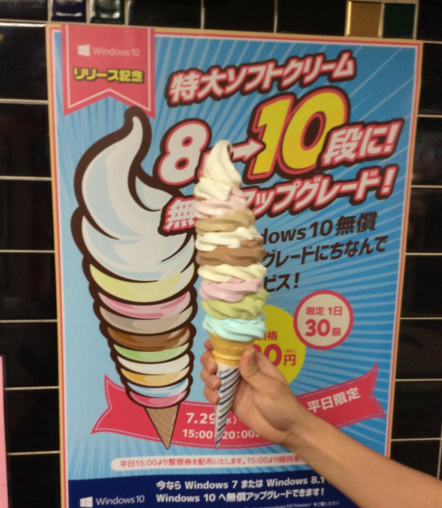 #Windows10 にちなんで無償アップグレードされた超特大ソフトクリーム、いかがでしたか? Windows 10は本日から1年間無償 #アップグレード 可能ですが、こちらのソフトクリームは2週間限定の企画ですのでお早めにどうぞ!
