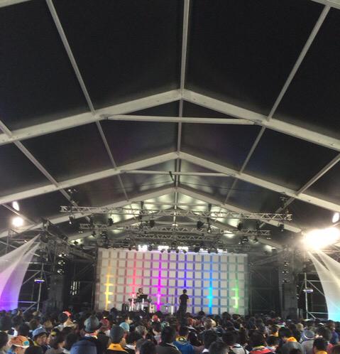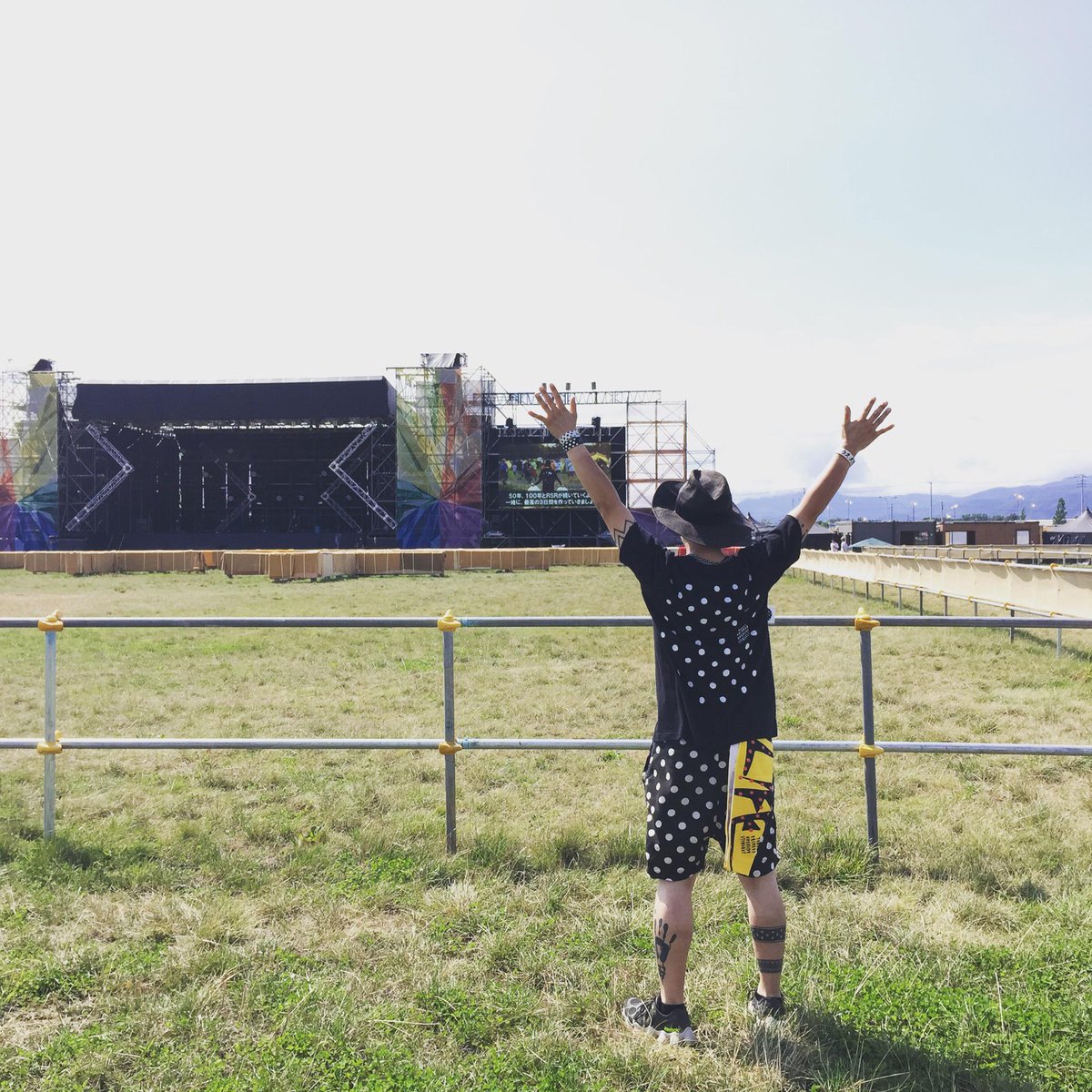 来たぞライジングサン!今日は「夏の大放出スペシャル」セットリストでお送りするので、みなさんラジオ体操しておいてねー!( ´ ▽ ` )ノ #RSR15 #EARTHTENT #17:10-