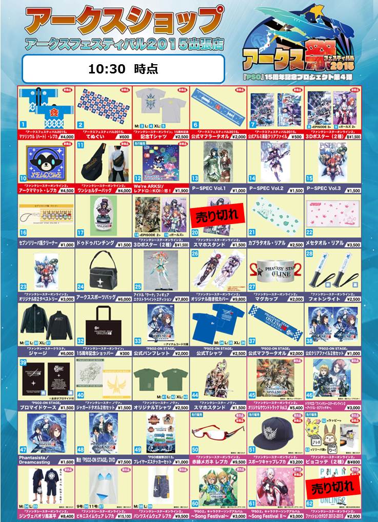 【アークス祭2015物販情報】10:30時点での完売アイテムをお知らせします。詳細は画像をご確認ください。 #PSO2 #アークスフェス