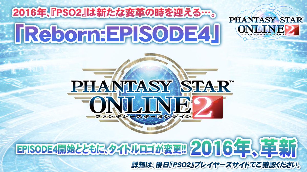 【『PSO2放送局』第34回放送中!!】「Reborn:EPISODE4」2016年、『PSO2』は新たな変革の時を迎える。EP3終了を迎えエピソード4の開始が発表されました!さらにEP4に合わせタイトルロゴも新たに革新! #PSO2