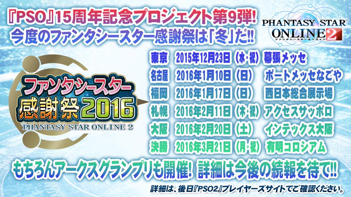【『PSO2放送局』第34回放送中!!】『PSO』15周年記念プロジェクト第9弾!「ファンタシースター感謝祭2016」が全国5都市で開催!もちろんアークスグランプリも開催です!今後の情報にもご期待ください! #PSO2