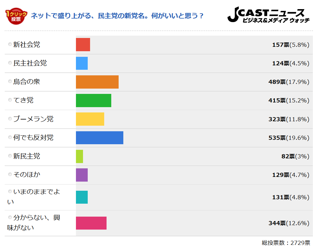 J-CASTニュースは、2か月前に「 #民主党の新しい党名を考える」をテーマにした投票を実施。「何でも反対党」(19.6%)がトップで、「烏合の衆」「てき党」などと続いてたじぇい! j-cast.com/2015/11/132505… pic.twitter.com/nEBZJbYtn2