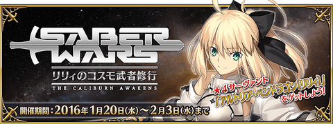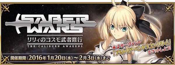 【予告】1/20(水)16:00より期間限定イベント「セイバーウォーズ~リリィのコスモ武者修行~」が開催されます!詳しくは→ news.fate-go.jp/2016/agtjcj/ #FateGO pic.twitter.com/WQc77e7q8p