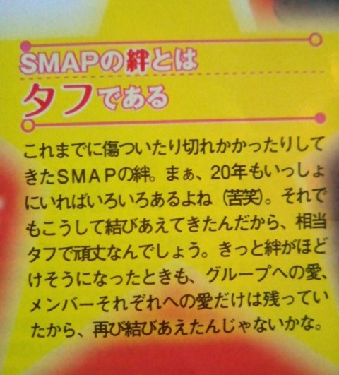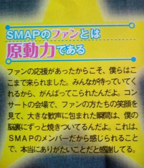 こちらは何もできないに等しい。今現在は誰も手も足も出せないような世界なんです。微力ですが、できることは一人でも多くSMAPの味方になってくれる方を増やしていくこと。ビクター、スポンサー様、番組スタッフ、関係者各位などに感謝して、お礼と購買は続けていきたい。 #SMAP