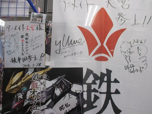 【鉄華団参上】本日、大宮店に「機動戦士ガンダム鉄血のオルフェンズ」ユージン役の梅原裕一郎さんと昭弘役の内匠靖明さんがご来店されましたみゃぉ!!本館にて鉄華団の旗とサインを展示していますのでぜひご来店ください! #g_tekketsu pic.twitter.com/zP8QcCzQZH