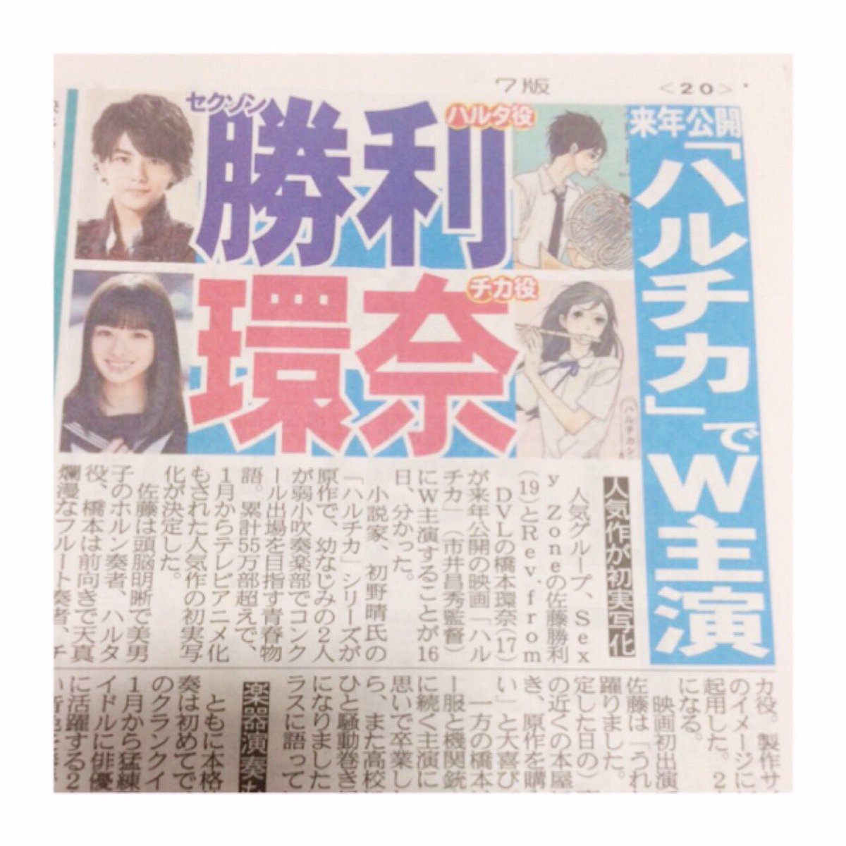 SexyZone佐藤勝利×橋本環奈、「ハルチカ」実写映画化で吹奏楽に挑戦! cinemacafe.net/article/2016/0… #ハルチカ #佐藤勝利 #橋本環奈 pic.twitter.com/jRdFLdglMg