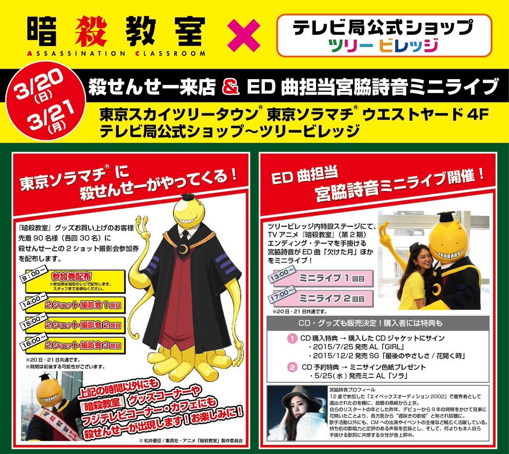 東京スカイツリータウン・ソラマチ内にて「暗殺教室」特設コーナー開催中!あさって20日(日)と21日(月祝)は”殺せんせー”とEDアーティストの宮脇詩音さんも来場ですよ♫ ansatsu-anime.com/news/detail.php? #暗殺教室 pic.twitter.com/z83EcHWT6V