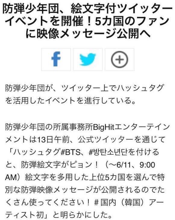 ハッシュタグ #BTS, #방탄소년단 を付けると防弾少年団の絵文字がドーン!(~6/11,9:00AM) 絵文字を一番たくさん使用した上位5か国には防弾少年団からスペシャル映像が!たくさん使ってください! #韓国アーティスト初 #BTS #방탄소년단