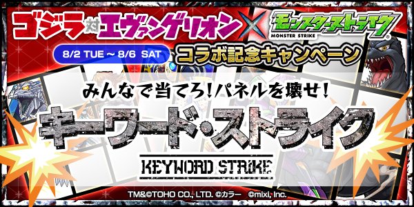 【ゴジラ対エヴァンゲリオン×モンスト】日替わりのパネルに隠された16個のキーワードをツイッターで予想し、豪華報酬やグッズを手にいれよう!パネルは毎日12時更新!詳細はこちら #モンスト godzilla-eva.monster-strike.com pic.twitter.com/yDzgFCpZaw