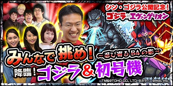 今夜20時~公式ニコ生!「"B4"を撃破せよ!」で「ゴジラ対エヴァンゲリオン」の降臨コラボクエストに"マックスむらい"が挑む!みんなのアドバイスが勝利の鍵! #モンスト monster-strike.com/news/20160729_… pic.twitter.com/R5kCTFMGYR