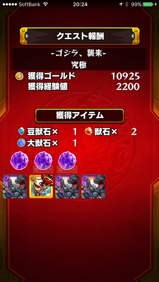 (;゜0゜)初見で挑戦したら、ギミックに全然対応してないメンバーで行っちゃって、ダメかと思ったけど勝てたよ(嬉泣)ゴジラ&初号機GET~❤︎ #モンスト pic.twitter.com/wawwISNvxm