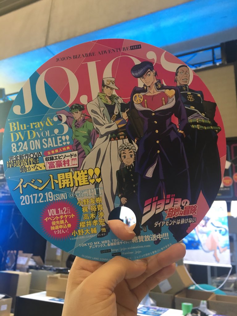 また、ワーナーブースでは「ダイヤモンドは砕けない」デザインの丸うちわも配布します。(配布は会場の混雑状況をみて開始致します。)会場内、暑くなっているので、ジョジョうちわをもらって是非、使ってください! #jojo_anime pic.twitter.com/dyhOl2FBYC