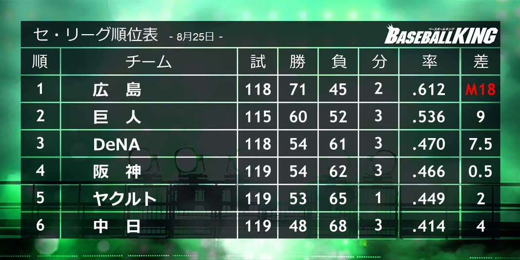 【セ・リーグ順位表】8月25日