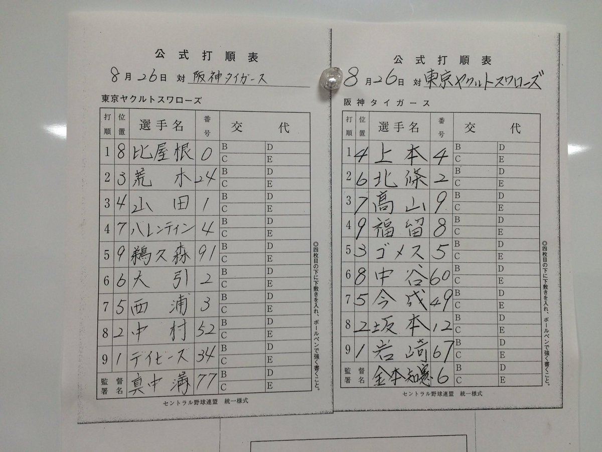 本日のスタメンです。 #swallows pic.twitter.com/nSuAPMzskc