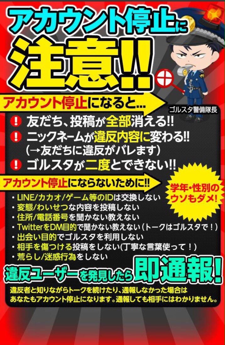中高生"以外"のユーザーによる未成年者への個人情報収集とわいせつ画像の投稿は禁止……つまりはそういうことだ…… #ゴルスタ