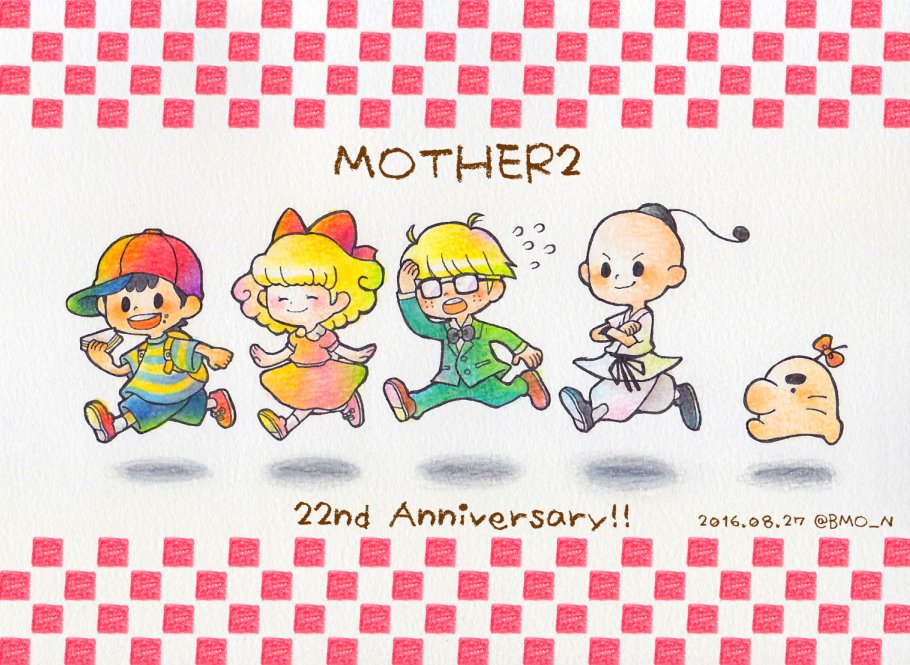 改めましてMOTHER2、22周年おめでとごじます!出遅れちゃったけど今年も大好きなよにん(+ひとり?)が描けてよーかったー!今日のおやつはスキップサンド♪ #MOTHER2_22th pic.twitter.com/82iefWVGVN