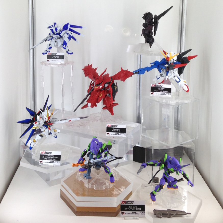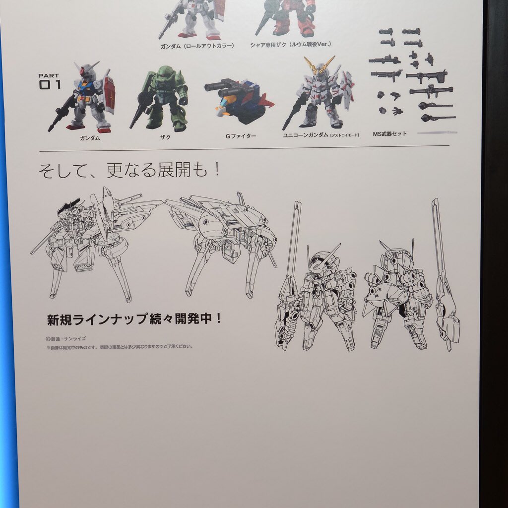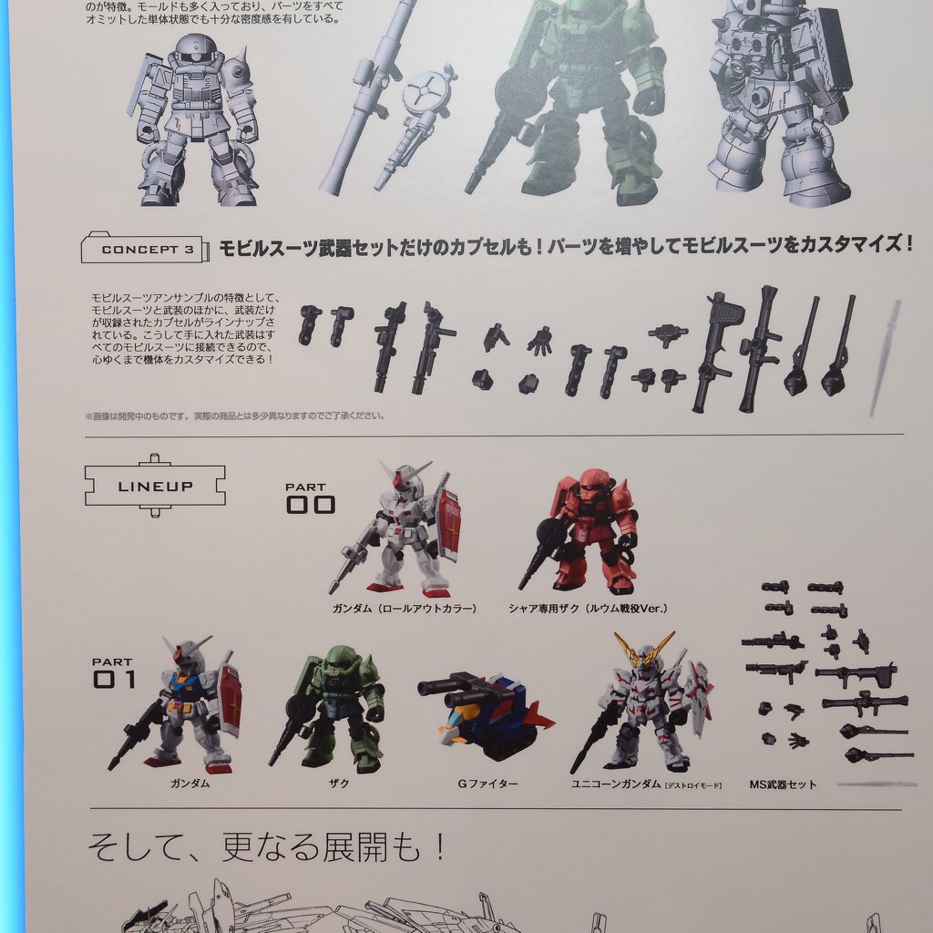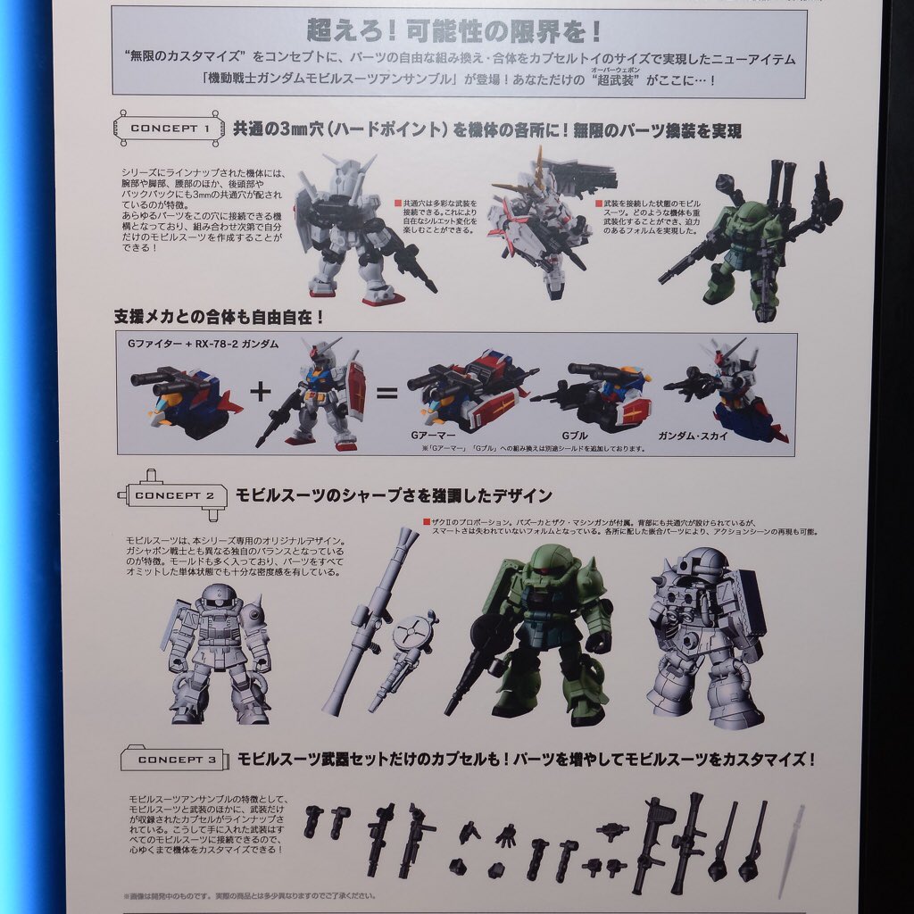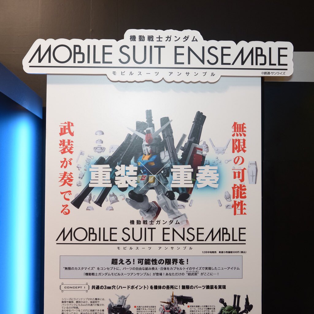 【 #C3TOKYO 2016】バンダイ ガシャポン新シリーズ『MOBILE SUIT ENSEMBLE』の初展示!こちらのシリーズには共通の3mm穴が機体の各所に配置され、無限のパーツ換装が実現されています。 pic.twitter.com/jbsrgw4xHI