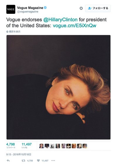 米ファッション雑誌「Vogue」がヒラリー・クリントン支持を表明。特定の大統領候補への投票を呼びかけるのは、1892年の創刊以来初 fashionsnap.com/news/2016-10-1… #米大統領選 #ヒラリークリントン pic.twitter.com/wYKGSrZBxH