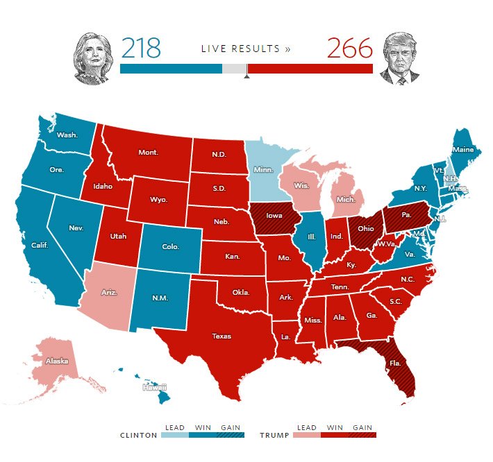 #アメリカ大統領選 の開票結果は、日本時間11時ごろの時点でこんな展開に。最新情報は #日経電子版「 #米大統領選 2016 開票ライブ」でご確認ください。
