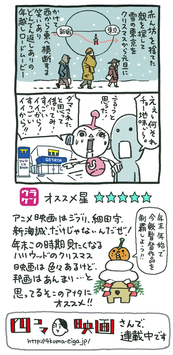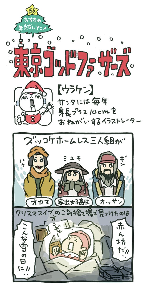 イブもクリスマスも何も予定ないよ!暇だよ!って人は東京ゴッドファーザーズを借りに行こう!ジブリ、細田守、新海誠だけがアニメ映画じゃないんだぜ! 4koma-eiga.jp/fourcell2/user… pic.twitter.com/vZYGN2wfzy2016年12月24日 08:58