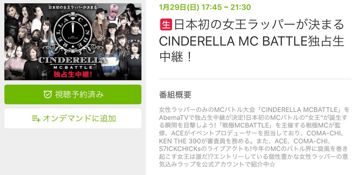 本日17:45~ #AbemaTV 日本初の女王ラッパーが決まるCINDERELLA MC BATTLE独占生中継にMCビキニ a.k.a 藤田恵名が出場するよー!!エナメル超頑張れ!!みんなコメントで応援しようね!!!!