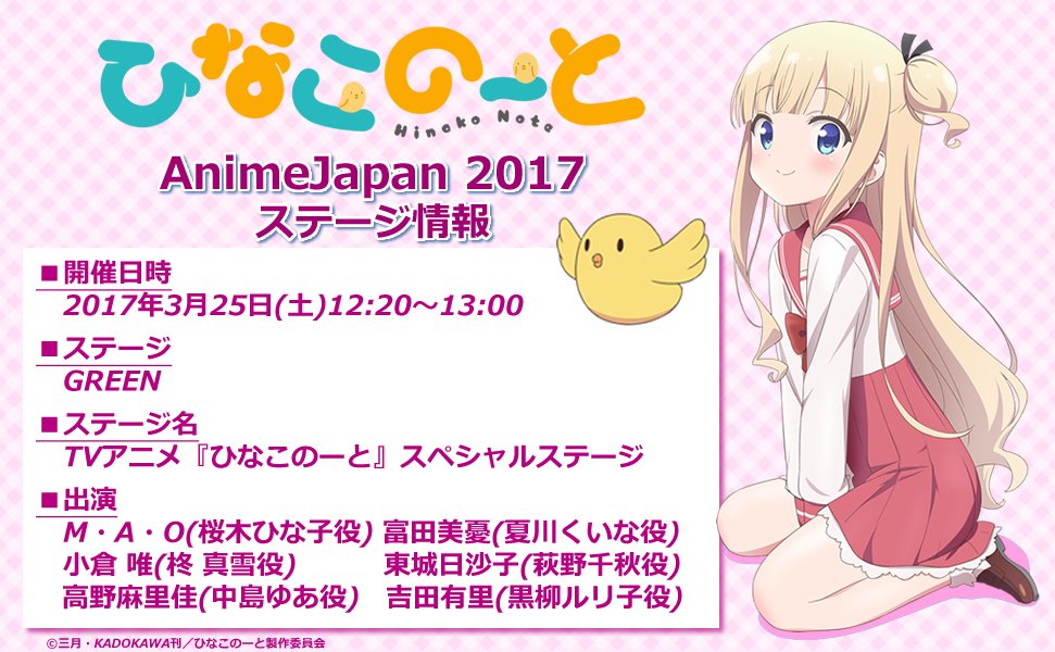 「AnimeJapan 2017」ステージ観覧抽選結果が発表されていますよ。応募した方は、確認はお済みですか?『ひなこのーと』のステージに当選した皆様、ステージ観覧券のお引き取りをお忘れなく!
