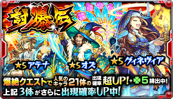明日12時(正午)~ガチャ「討爆伝」開催!「爆絶クエスト」で人気の21体の出現確率UP&ラック5排出!「グィネヴィア」「オズ」「アテナ」の3体は出現確率が更にUP! #モンスト monster-strike.com/news/20170318_… pic.twitter.com/wVqWt2q3aJ