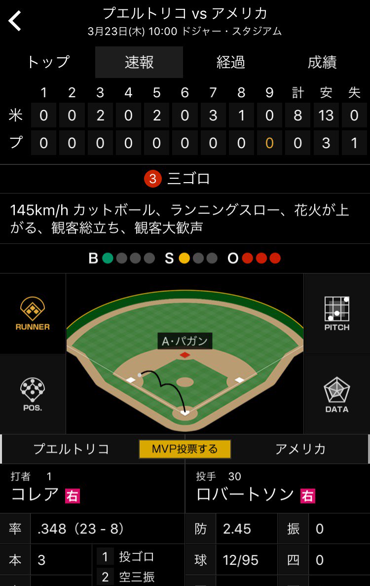 ▼ 🇵🇷 0 - 6 🇺🇸(7回表)
