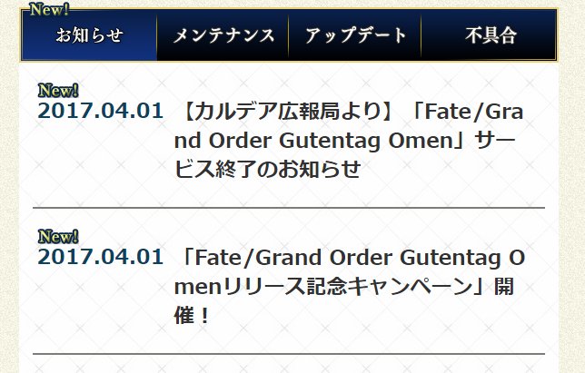 諸般の事情により『Fate/Grand Order Gutentag Omen』は2017年4月1日(土)23:59をもちまして、サービスを終了いたします。