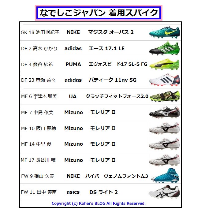 スタメン11名の着用スパイクリスト