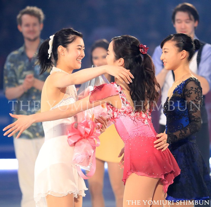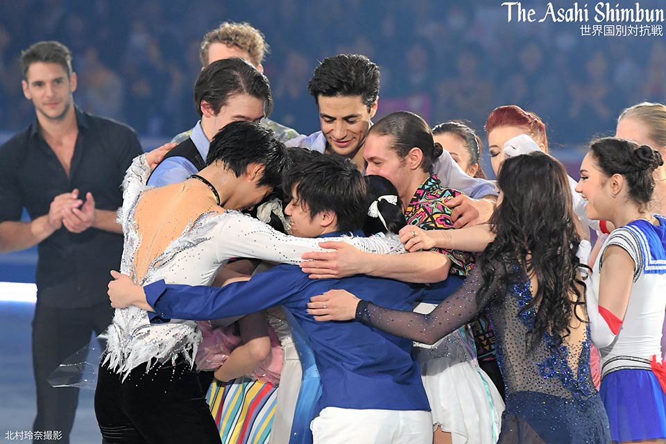 #世界国別対抗戦、エキシビションのフィナーレでは、引退を宣言した #村上佳菜子 選手を #羽生結弦 選手、 #宇野昌磨 選手らが囲みました。(達) #WTTFigure #figureskate #HanyuYuzuru pic.twitter.com/tO9ETLuXMP2017年4月23日 18:04