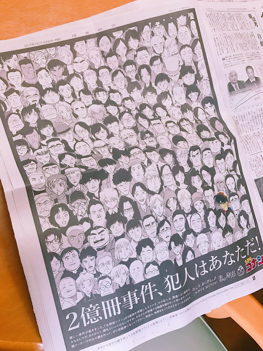 【祝!青山剛昌2億冊突破】あなたも自分の顔を作って『名探偵コナン』の容疑者に応募しよう。新聞号外の詳細もコチラ! conan-face-maker.com/share/017/XgzT… #コナン顔メーカー #名探偵コナン