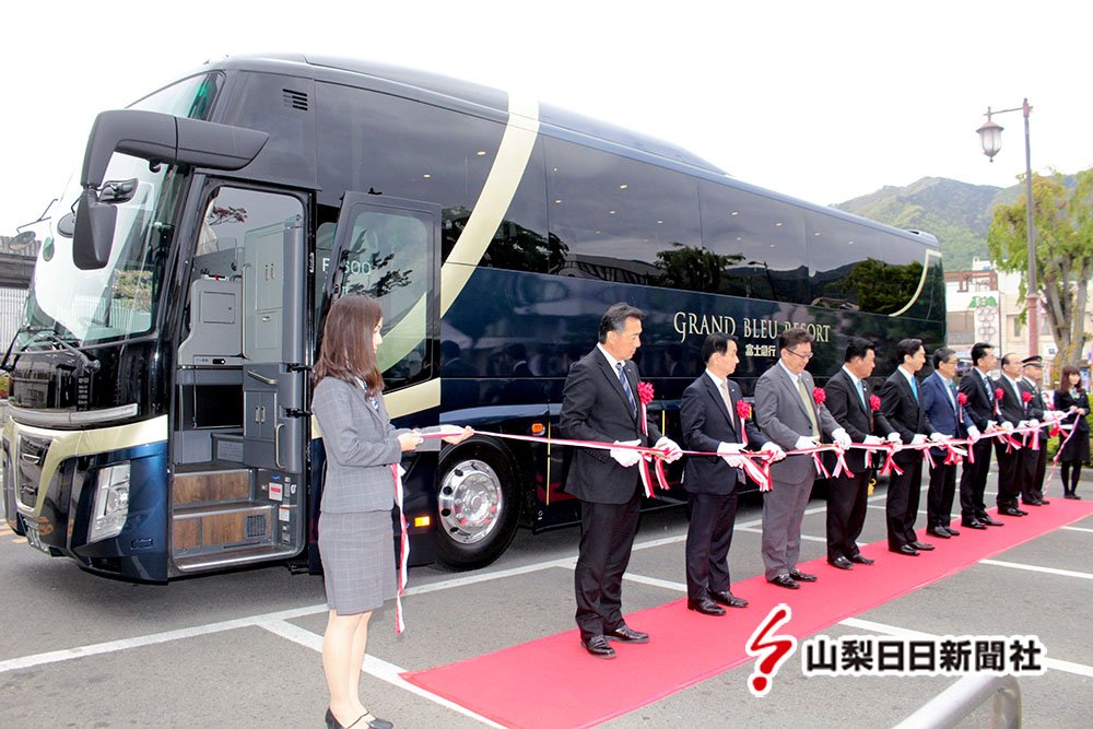 富士急山梨バス(富士河口湖町小立)は1日、甲州市のJR塩山駅で、豪華貸し切りバス「グランブルーリゾート」の出発式を行った。
