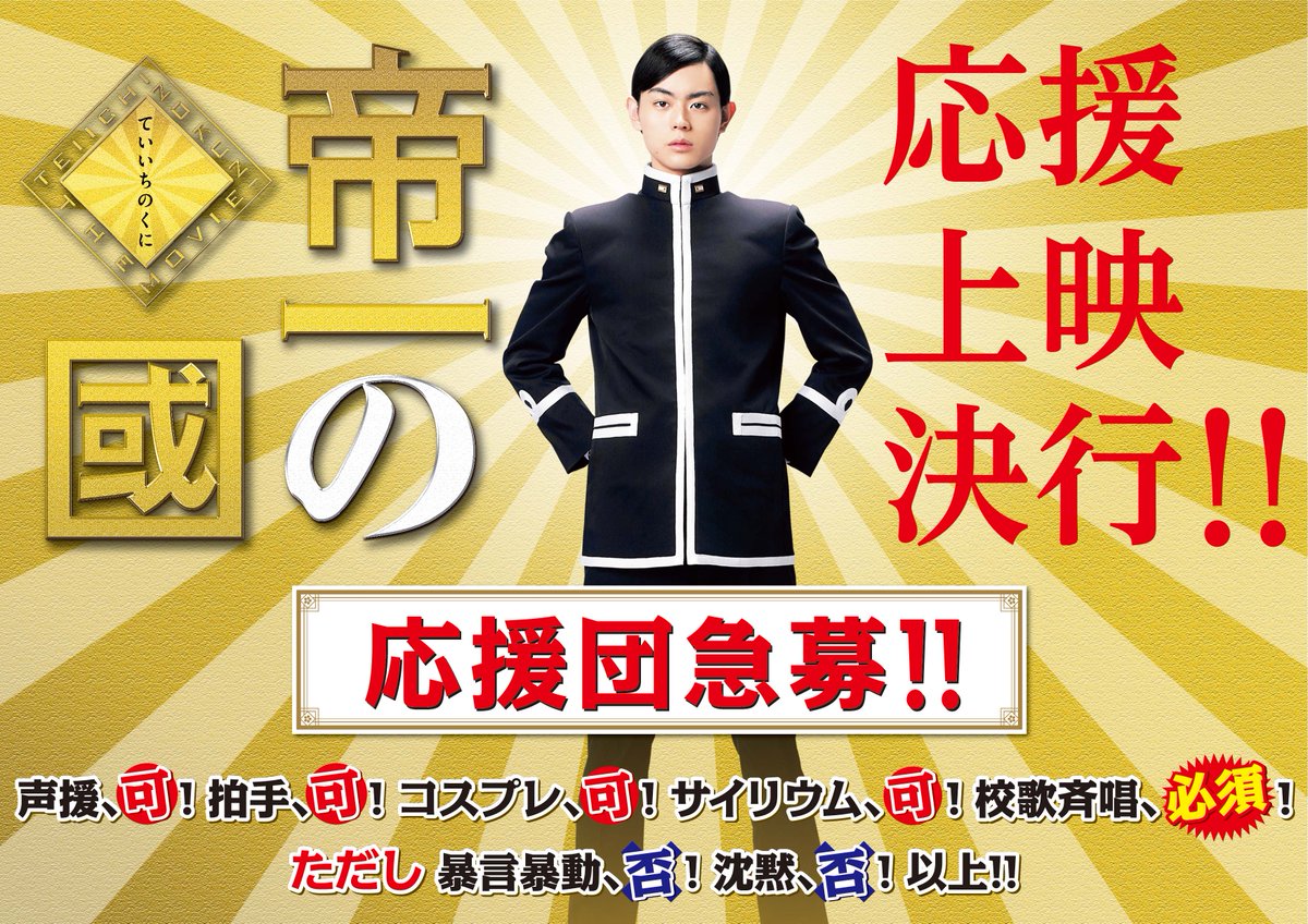 おかげさまで大ヒット中の「帝一の國」、応援上映が決定しましたーー!!みんなで盛り上がりながら、そして突っ込みも入れてもらいながら(笑)一緒に「帝一の國」を見ましょう!!! #帝一の國 #応援上映 #菅田将暉 #野村周平 #竹内涼真 #間宮祥太朗 #志尊淳 #千葉雄大 #永野芽郁 twitter.com/teiichi_movie/…
