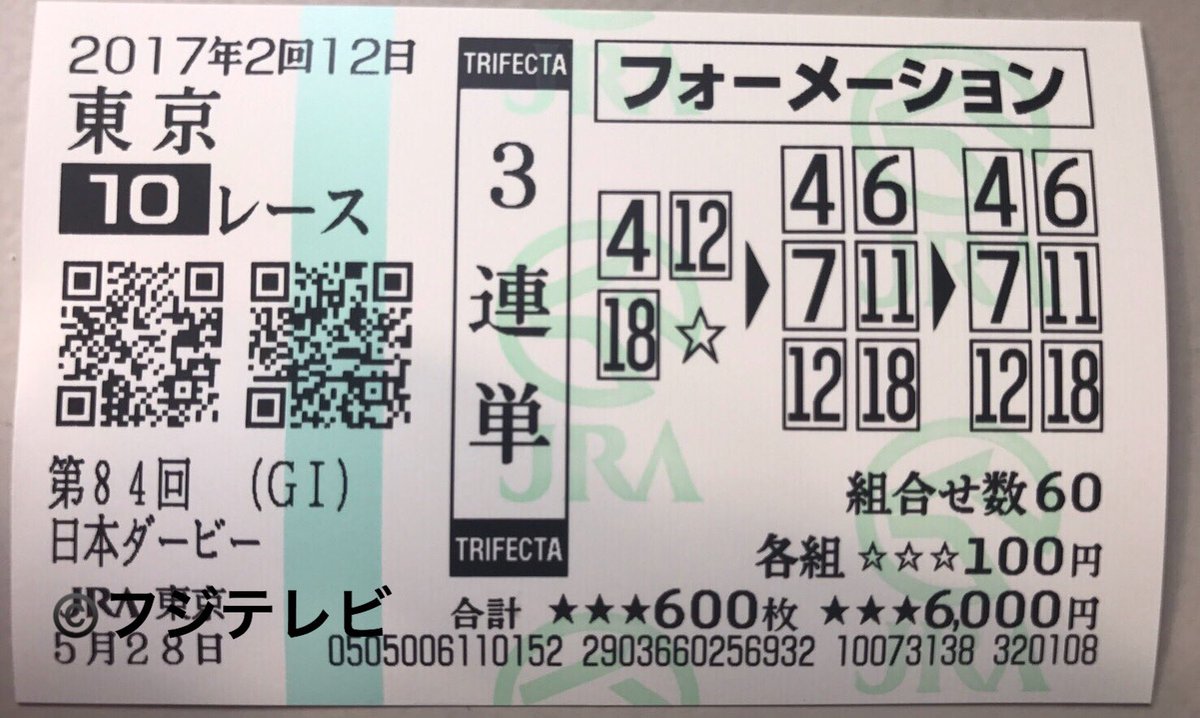 #フジテレビ競馬 #みんなのKEIBA #3連単 #馬券画像 #日本ダービー pic.twitter.com/quCJeOqzLV2017年5月28日 15:24