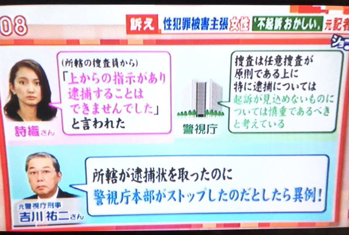 元警視庁刑事吉川祐二氏によれば、逮捕状を取ったのに警視庁本部がストップしたのであれば異例と。それに加えて菅野朋子弁護士は、詩織さんが捜査員から示談を勧められたということについても、普通はない、捜査員はそこまで関わらないと指摘。