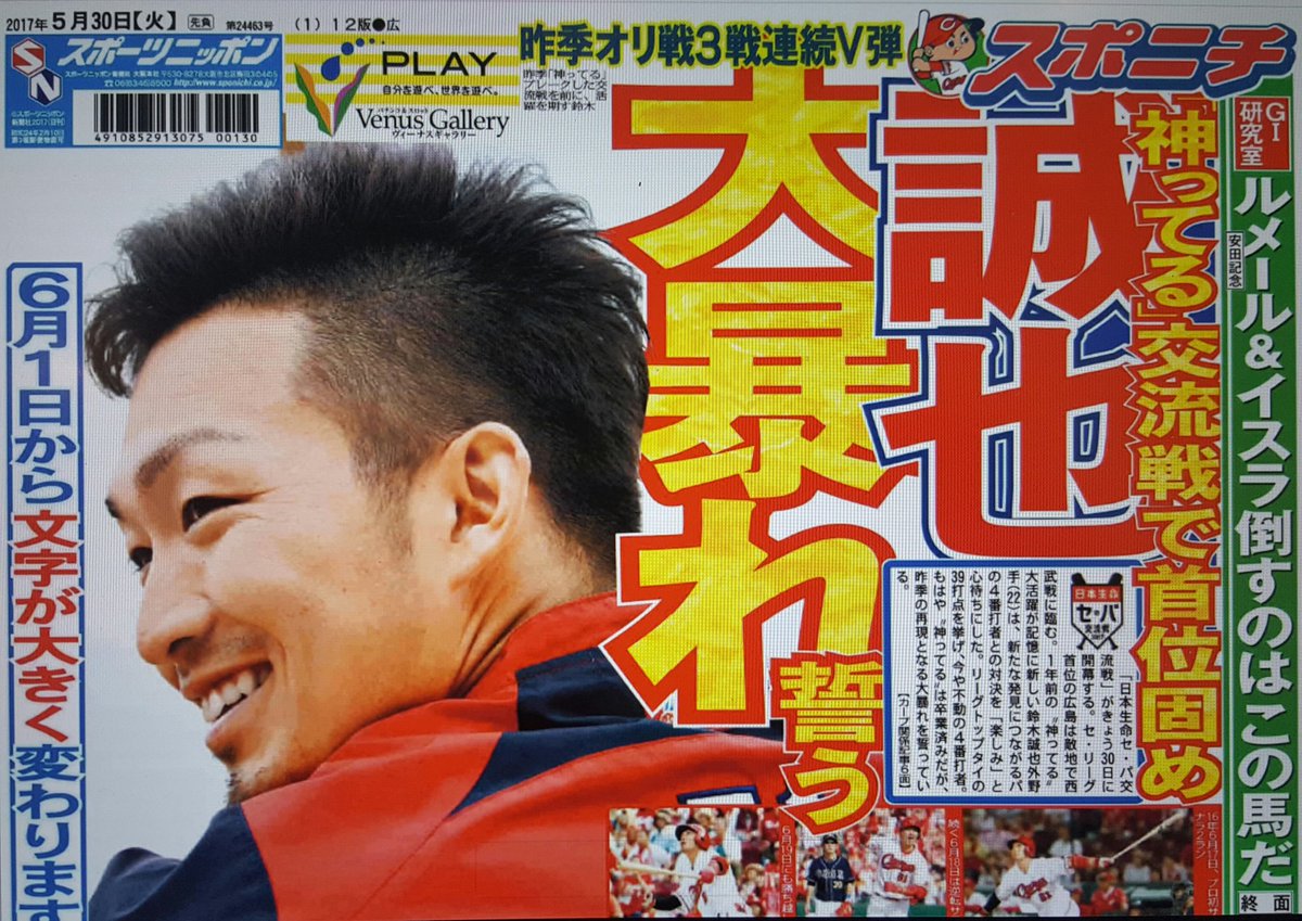 #スポニチ #交流戦 #carp #鈴木誠也 pic.twitter.com/k8latnCPLG2017年5月30日 12:07