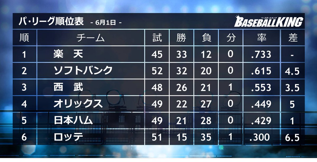 【パ・リーグ順位表】6月1日