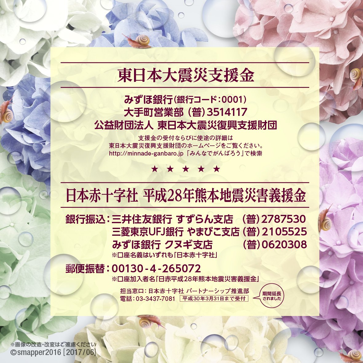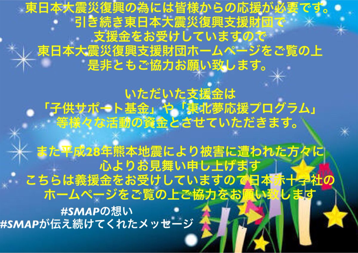 #震災復興 #義援金にご協力お願いします #震災に向けて手を繋ごう #スマスマ #SMAP pic.twitter.com/jDD5HmkLmj2017年7月3日 22:00