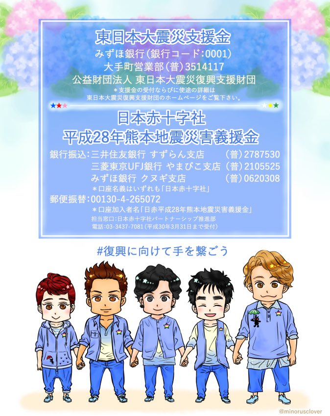 震災から6年が経ちますが、復興の為にはまだ皆様からの応援が必要です。SMAPも発起人の東日本大震災復興支援財団 minnade-ganbaro.jp/shien/donation/ は継続支援中。熊本地震は赤十字へ。一人は少額でも継続して集まれば大きな力になります。 #復興に向けて手を繋ごう #スマスマ