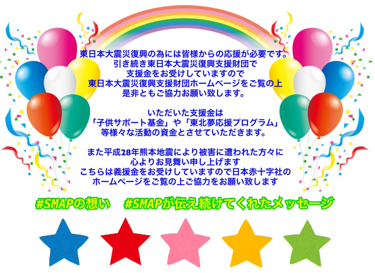 #東日本大震災支援金 #復興に向けて手を繋ごう #平成28年熊本地震災害義援金 #スマスマ #SMAPが伝え続けてくれたメッセージ #SMAPは終わらない #SMAPとファンが笑顔になれますように スマスマの時間です。SMAP5人揃った姿に会いたいです。 pic.twitter.com/lwh92e5yNZ