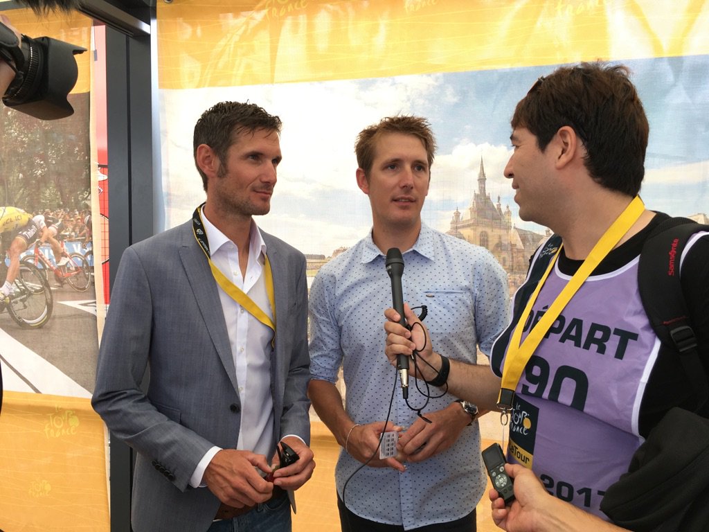 ツール第4ステージはルクセンブルクをスタート。 @sascha348 さんがシュレク兄弟にインタビュー中。 #jspocycle pic.twitter.com/ggQjQ8HbkR